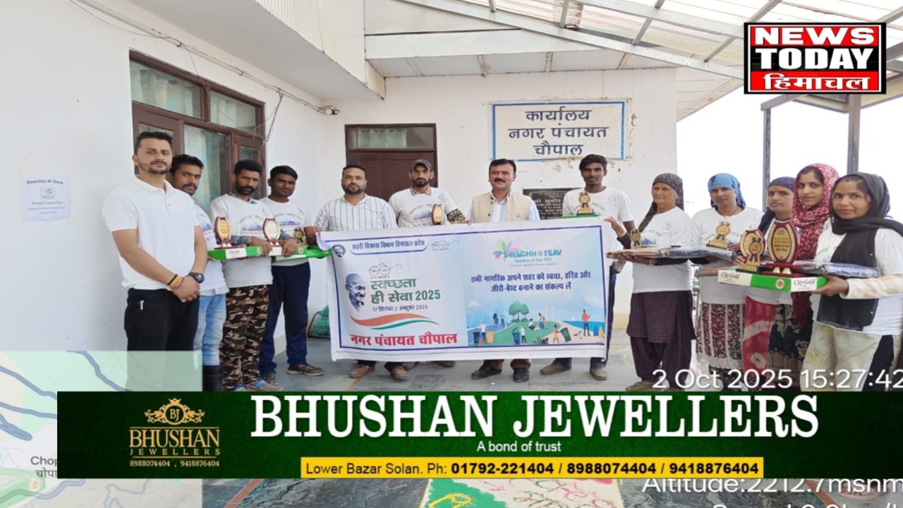 आज दिनांक 2-10-2025 को नगर पंचायत चौपाल में राजिंदर झरटा की अध्यक्षता में “स्वच्छता ही सेवा ” अभियान का समापन समारोह का आयोजन किया गया जिसमें नगर पंचायत चौपाल के अधिकारियों तथा सफाई कर्मचारियों ने मिल कर सम्पूर्ण चौपाल बाजार की सफाई की तथा सभी दुकानदारों को सफाई के प्रति जागरूक किया गया। उसके बाद सफाई कर्मचारियों के लिए पुरस्कार वितरण समारोह भी किया गया जिसमें कर्मचारियों के पूरे साल भर की मेहनत और लगन को देखते हुए उन्हें सम्मानित किया गया। घर घर जाकर कूड़ा उठाने में अर्चना प्रथम , सुषमा दूसरे तथा रमेश तृतीय स्थान पर रहे वही सेनिटेशन वर्कर – सड़कों ओर रास्तों की सफाई में राजू प्रथम, नरेश दूसरे तथा विपिन तृतीय स्थान पर रहे तथा अन्य सभी वर्करों को भी को भी पुरस्कार दे कर सम्मानित किया गया ।